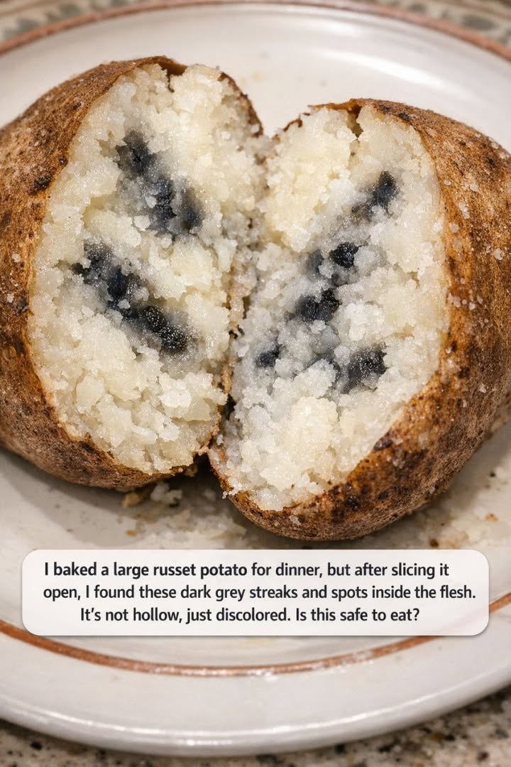 Imagine preparing a comforting meal by baking a large russet potato, one of those versatile ingredients that can transform into a myriad of delicious dishes. You’ve spent time ensuring it’s perfectly cooked, eagerly anticipating the fluffy, steamy interior. However, upon slicing it open, you’re met with unexpected dark grey streaks and spots within the creamy flesh. This sight can be quite disconcerting, raising valid concerns about whether this potato is safe to eat.