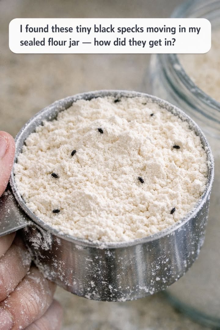 I found these tiny black specks moving in my sealed flour jar — how did they get in?